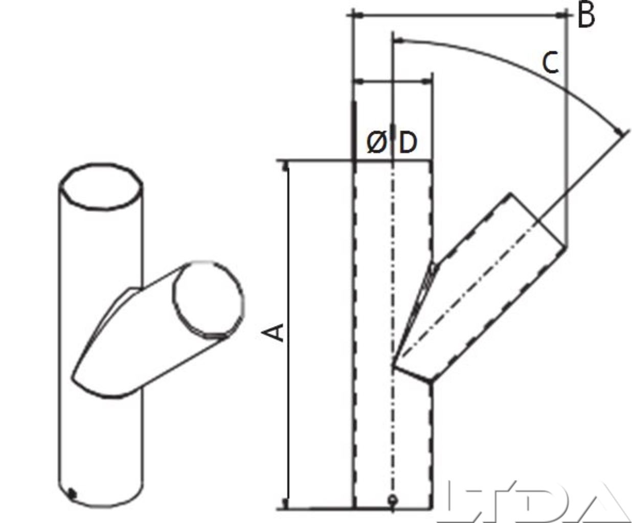 Dérivation en acier galvanisé 50mm Cette Dérivation vous sera utile si vous décidez de construire votre propre réseau pour aspirateur central. A= 220 B= 140 C= 45° D = 50