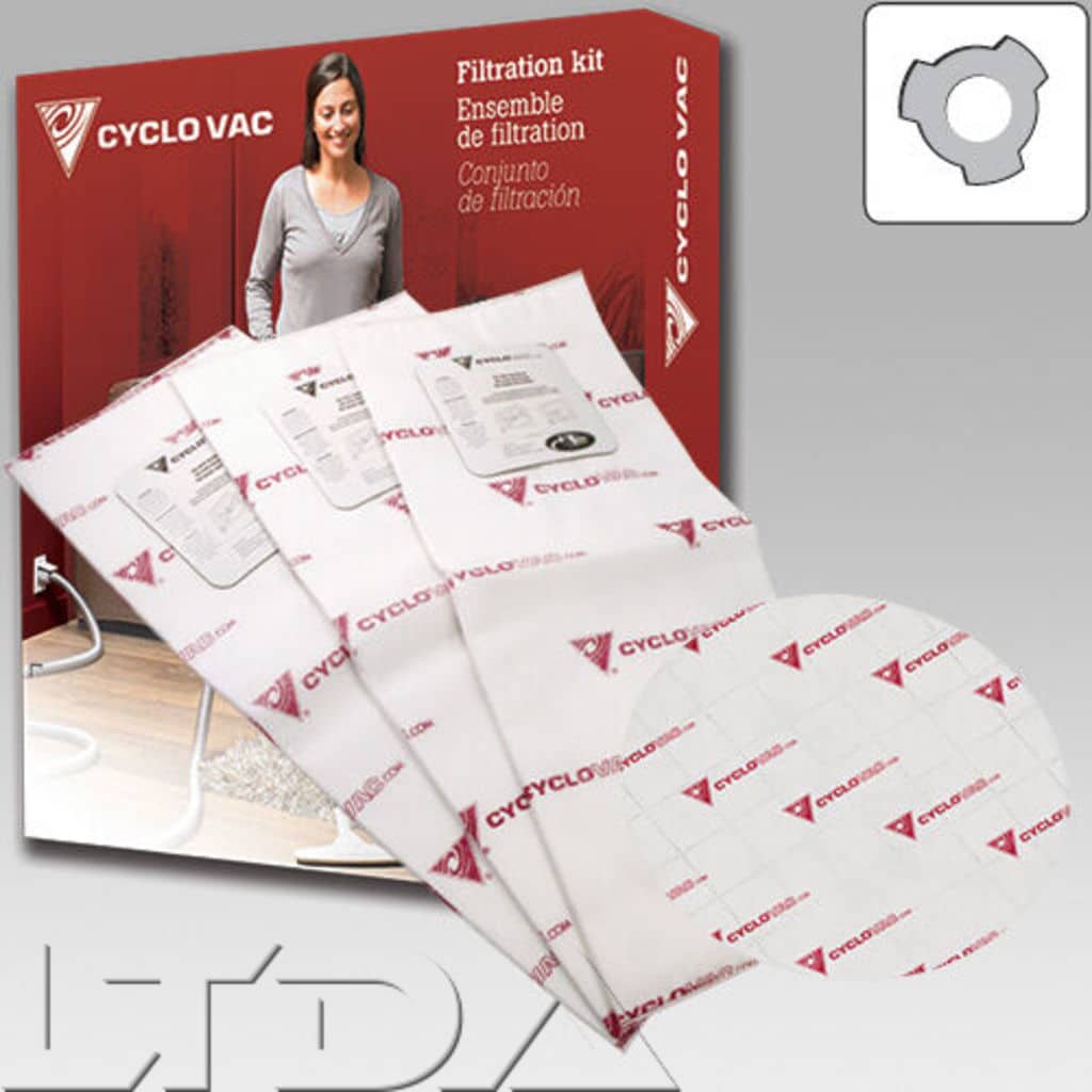 Paquet de 3 sacs + 1 rond pour système daspiration centrale. Ces sacs à 3 crans de 8.7 litres retiennent la poussière et permettent de garder. peu importe le remplissage. une puissance daspiration maximale pour la centrale. Le filtre rond a reçu un traitement antimicrobien qui empêche le développement des bactéries. moisissures et champignons. Compatible avec les centrales CYCLOVAC : E100 (2002-2006). AXESS (2007-2009). CONSTRUCTOR (2007-2009).